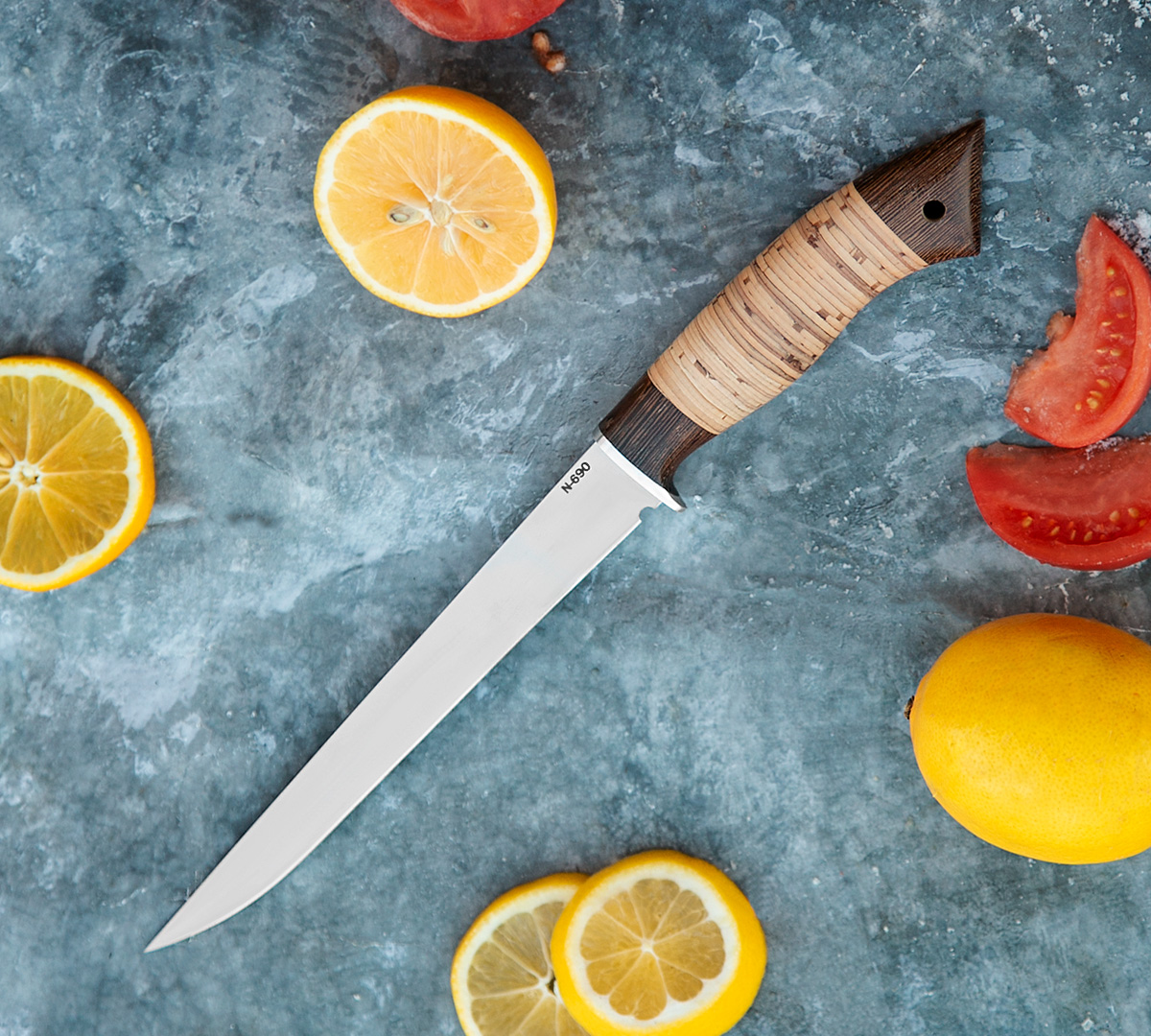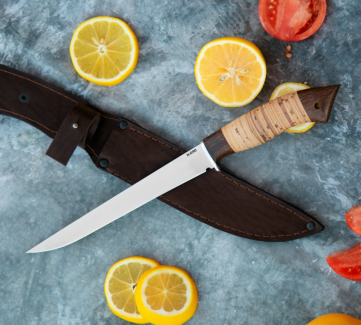 Филейный нож из нержавеющей стали N690, рукоять - венге + береста, кожаный чехол в комплекте.