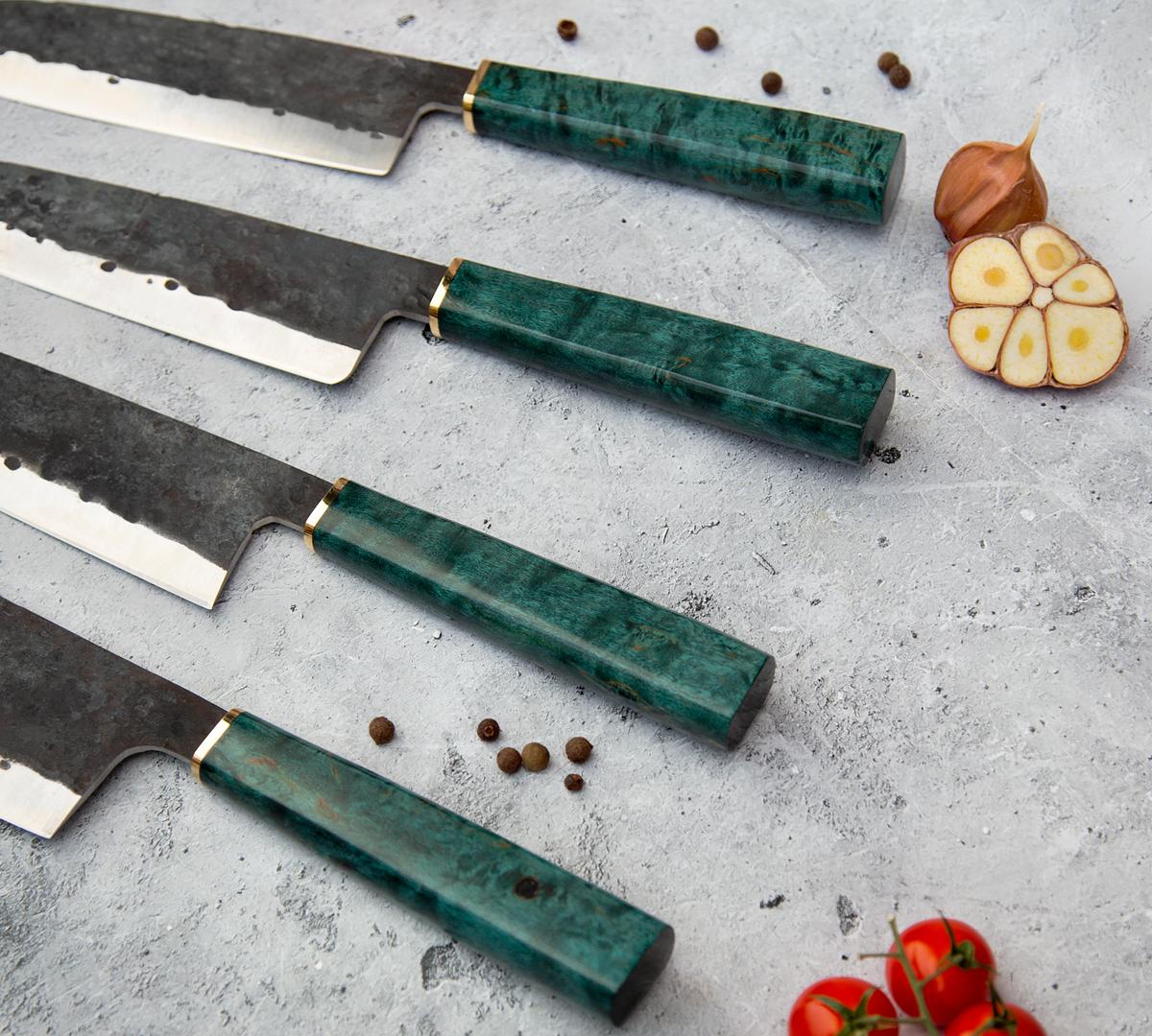 Набор кухонных ножей из стали N690, рукоять - стабилизированная карельская береза