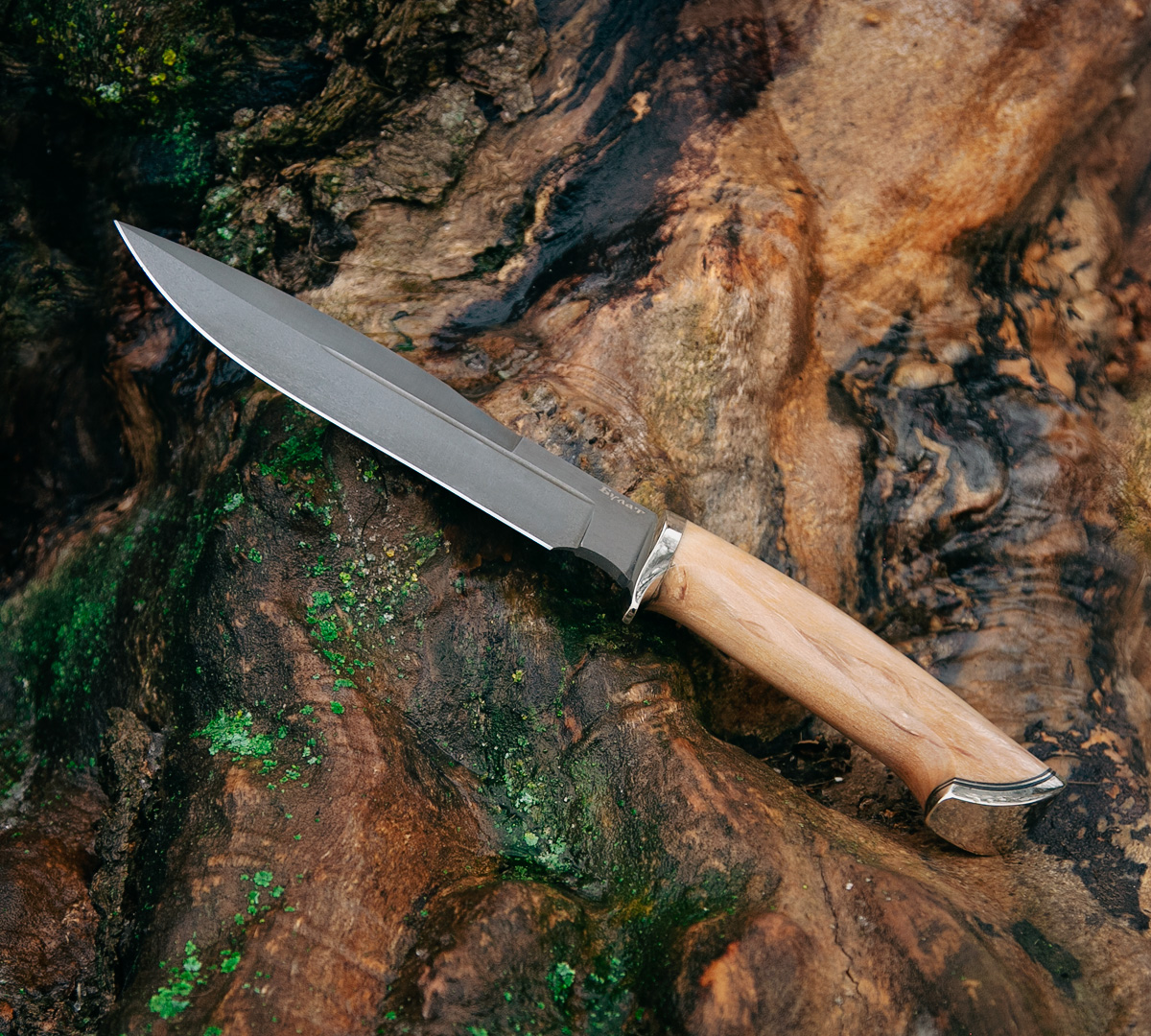 Нож Боцман из булатной стали, рукоять - стабилизированная карельская береза, кожаный чехол идет в комплекте.