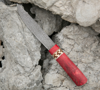 Северный нож из дамасской стали, рукоять - стабилизированная карельская береза, вставка рог, кожаный чехол идет в комплекте.