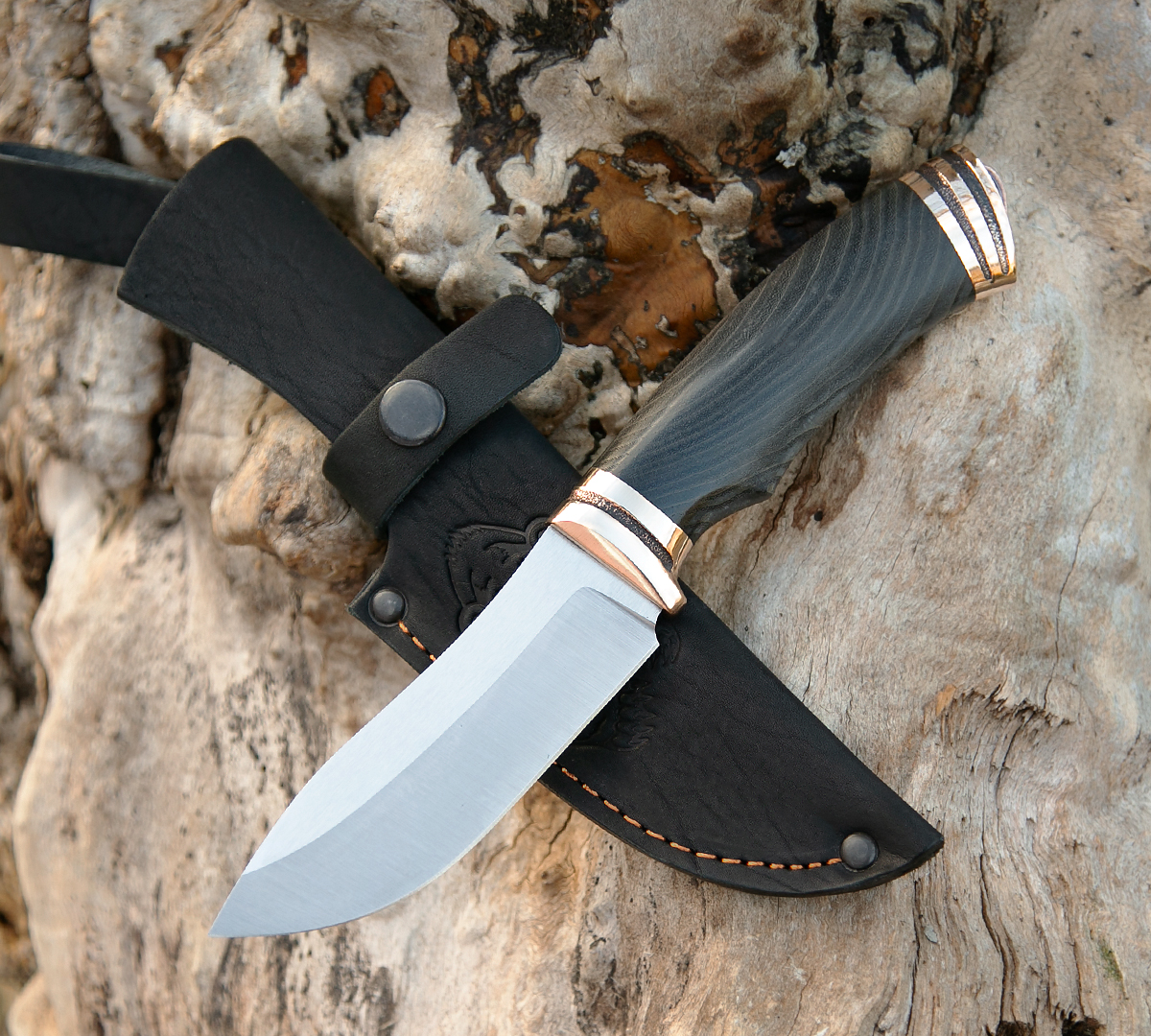 Нож Кабан из порошковой стали S390, рукоять - стабилизированный дальневосточный ясень, кожаный чехол в комплекте.